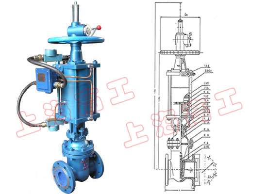 1、 本閥主要由閥體、閥蓋、閘板、閥桿、密封圈、雙層氣缸及其活塞、活塞桿、隔板連同緩沖機(jī)構(gòu)、手動(dòng)機(jī)構(gòu)、氣動(dòng)-手動(dòng)轉(zhuǎn)換裝置和閥蓋填料裝置等部分組成。